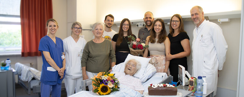 In ihrem geliebten Garten konnte die aktive Seniorin ihren 104. Geburtstag zwar nicht feiern, dafür aber trotzdem im Kreise ihrer Familienangehörigen. Am Samstag kam ein Teil der Familie für diesen besonderen Anlass ins Krankenhaus, um Zeit mit der zweifachen Mutter und Oma sowie fünffachen Uroma zu verbringen. Von ihrer Tochter gab es Kuchen, der auch mit den Mitarbeitenden geteilt wurde. Vom Krankenhaus gab es einen Blumenstrauß und Glückwünsche von Priv.-Doz. Dr. Paul Schmitz: „Ich wünsche ihr, dass sie schnell wieder auf beide Beine kommt, wieder laufen kann und weiterhin viel Lebensfreude hat! Das ist das oberste Ziel!“ Ein 104. Geburtstag ist in St. Josef nämlich auch noch nie gefeiert worden.