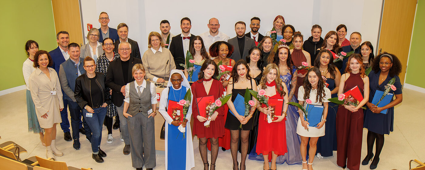 Insgesamt 29 Schülerinnen und Schüler haben ihre generalistische Pflegeausbildung am PflegeCampus Regensburg erfolgreich abgeschlossen. Der Jahrgang startete 2023 zu etwa gleichen Teilen mit Auszubildenden aus dem Caritas-Krankenhaus St. Josef Regensburg und dem Universitätsklinikum Regensburg, den beiden Trägerkrankenhäusern der Berufsfachschule. Die Abschlussklassen serenità und amorconcor zeichneten sich dabei besonders durch ihre kulturelle Vielfalt und ihre heterogenen biografischen Hintergründe – zum Teil bereits mit absolviertem Studienabschluss, zum Teil direkt von der Regelschule – aus.