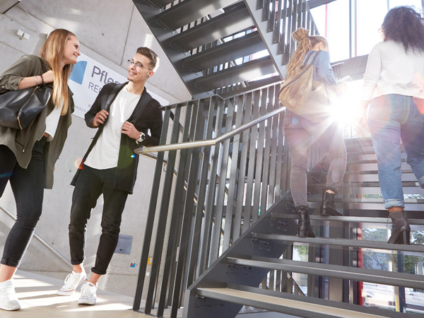 Die Klassenräume sind großzügig geschnitten und mit modernen Medien ausgestattet. Die Atmosphäre ist konzentriert und entspannt zugleich: Überall sind junge Leute im Gespräch miteinander, die gemeinsam lernen und sich austauschen. Zusammenhalt wird am PflegeCampus großgeschrieben.