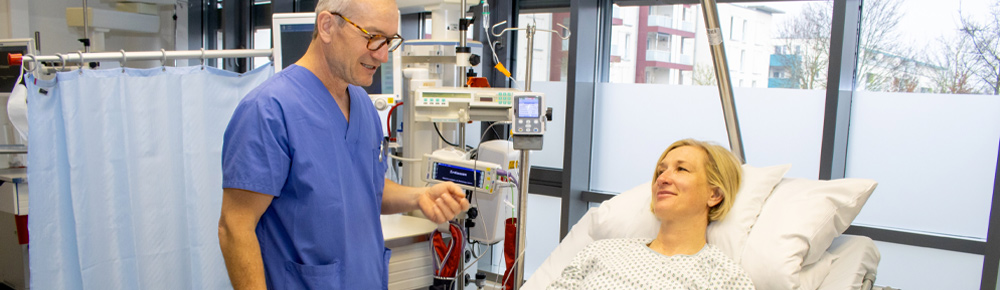 Patientinnen und Patienten mit Schmerzen zu betreuen, die Schmerzen ertäglich zu machen und eine schnelle Erholung zu ermöglichen gehört zu den Aufgaben der Schmerztherapie. Nach großen chirurgischen Eingriffen, aber auch bei Tumorschmerzen steht das speziell ausgebildete Team der Klinik für Anästhesiologie, Intensiv- und Notfallmedizin Betroffenen mit schmerztherapeutischen Methoden zur Seite.