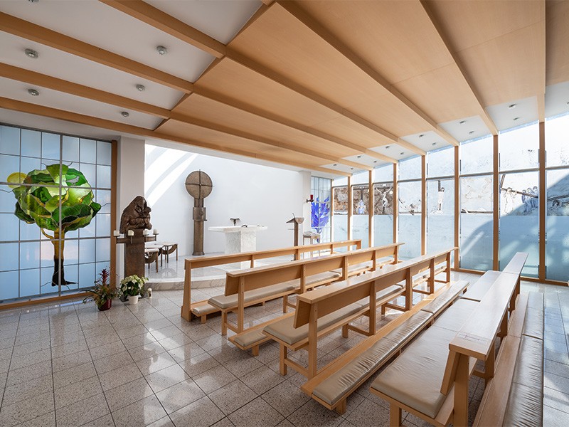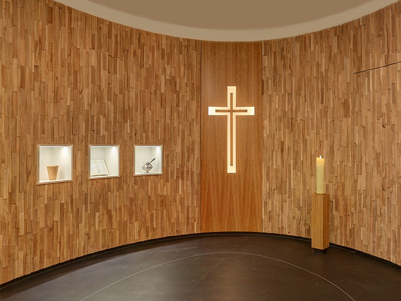 Die Kapelle wurde von dem Künstler Alfred Böschl gestaltet und 1997 eingeweiht. Hell und lichtdurchflutet lädt sie zum stillen Gebet und auch zur Feier der Gottesdienste ein. Es sind gerade auch die ins Glas eingelassenen Kreuzwegstationen, die zur Meditation über das eigene Leben anregen.