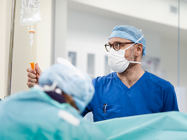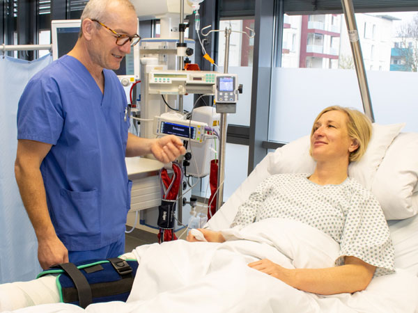 Nach der Operation erfolgt die Überwachung der Patientinnen und Patienten im Aufwachraum durch die Ärztinnen und Ärzte der Anästhesie und durch erfahrenes Anästhesie- und Intensivpflegepersonal. Hier wird bereits mit der Schmerztherapie begonnen, die dann auf den Stationen an das jeweilige Schmerzniveau angepasst und weitergeführt wird.