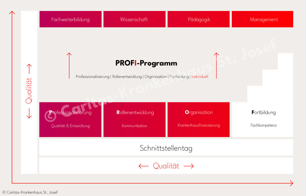 Durch einzelne Maßnahmen wie das klassische Einarbeitungskonzept wird eine qualitative Basis geschaffen. Ein Schnittstellentag hilft nach der Einarbeitungsphase die Strukturen und die Zusammenhänge im gesamten Krankenhaus kennen zu lernen. Darauf aufbauend bilden einzelne thematische Personalentwicklungsbausteine wesentliche Themen des Gesundheitswesens ab. Im Rahmen der Personalentwicklungsbausteine kann das Potenzial von Mitarbeitenden erkannt und gefördert werden. Die Bausteine P-R-O-F werden durch ein I ergänzt und bilden schlussendlich das PROFI-Programm.